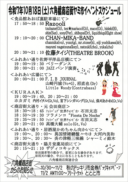 ※イベント出演者等につきましては、HP、SNS掲載の「六角橋商店街ヤミ市イベントスケジュール」をご覧ください。